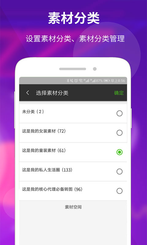 用户对自己发布的素材可以做分类,比如“这是我的童装素材库”“这是我的女装素材库”“这是我的私人生活圈”等。