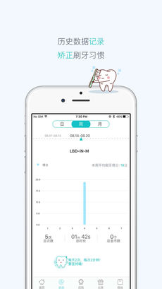 4、刷牙数据:通过每次同步数据可记录您的每次刷牙结果,您可以日、周、月的形式查看自己的历史数据。