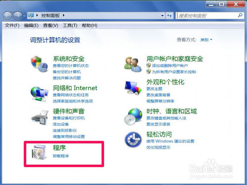 进入控制面板窗口后,在其界面中,找到并打开“程序”这一项。