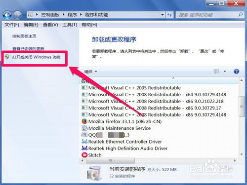 在打开的程序和功能窗口中,点击“启用或关闭Windows功能”快捷链接