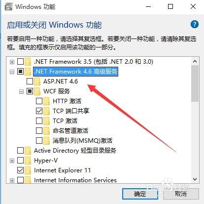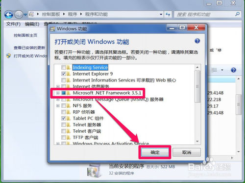 找到后,将其选上即可,按确定,就打开了net framework功能。