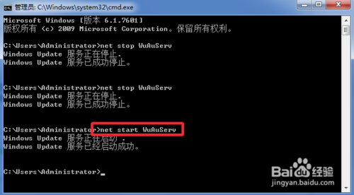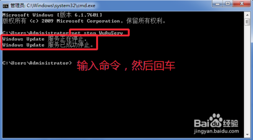 然后在命令提示符界面输入命令net stop WuAuServ,停止运行更新服务。