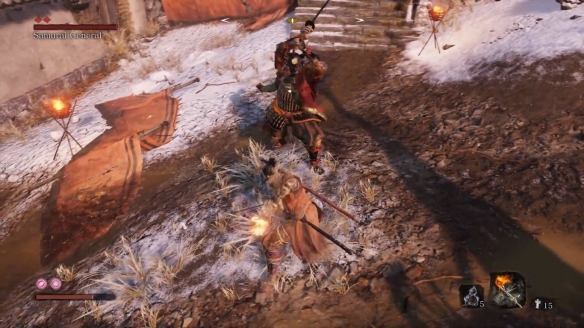 双方拔刀,战斗开始。玄一郎的攻击方式主要有冲刺斩击,上挑,下劈,普通挥砍,碍于血量劣势主角不敌战败(剧情强制),其实这个BOSS不难,难度就是一个精英怪,非常适合做弹刀的练习,攻击不会快也不会延迟出招,只不过就算这里打败了这个BOSS之后还是会冒出一个新的和你车轮战直到主角战败为止。