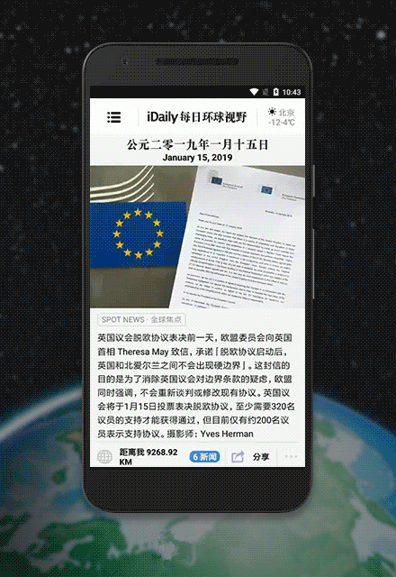 对此,「iDaily」试图用空间距离营造用户与新闻热点之间的共鸣,在每条新闻下附上了「距离我xxx公里」的标签。在开发团队看来,地球上发生的每件事,与我们的距离都不会超过 20,000 公里,那些看似遥不可及的地方,也许离我们并不远。