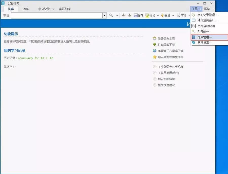 依次点击欧路词典主界面右上角“工具”---“词库管理”