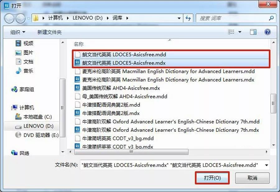 按住 CRTL键同时选择一部词典的mdd文件和mdx文件,点击“打开” (注意mdd和mdx这两个文件的文件名必须保持一致)