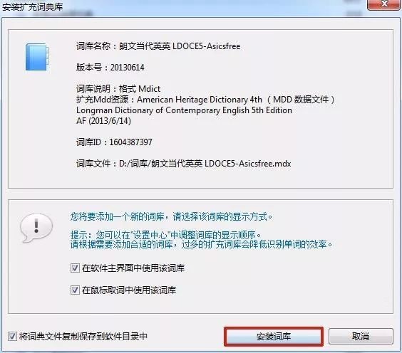 出现询问是否安装词典的对话框,点击“安装词库”,即可完成扩展词库的安装。