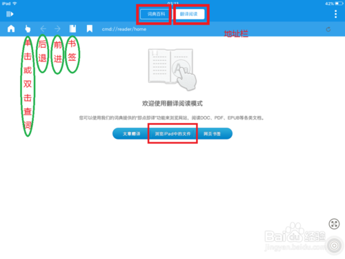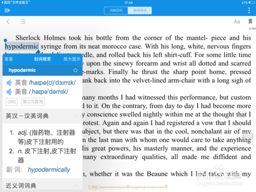 英英词典,包含10万条英英解释;50万条常用例句库,不需联网也能搜索例句;文章短句翻译功能