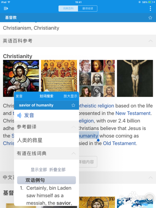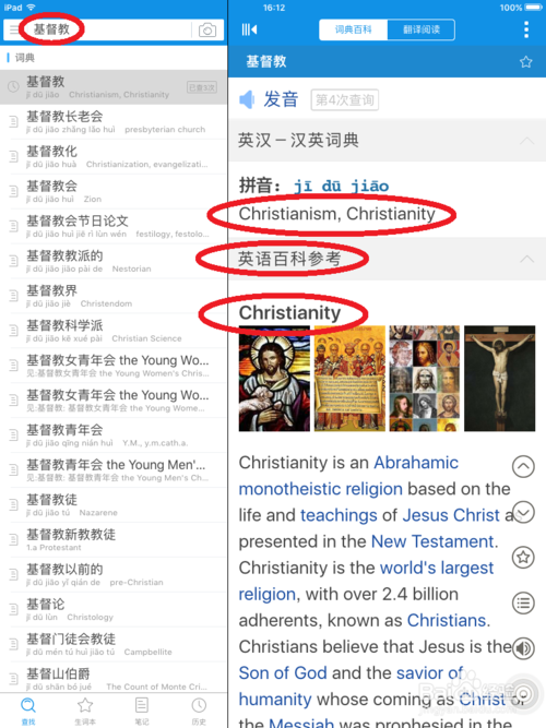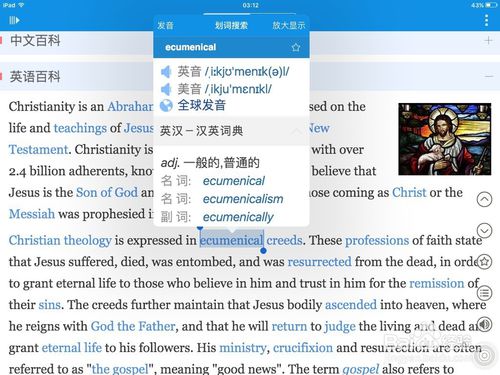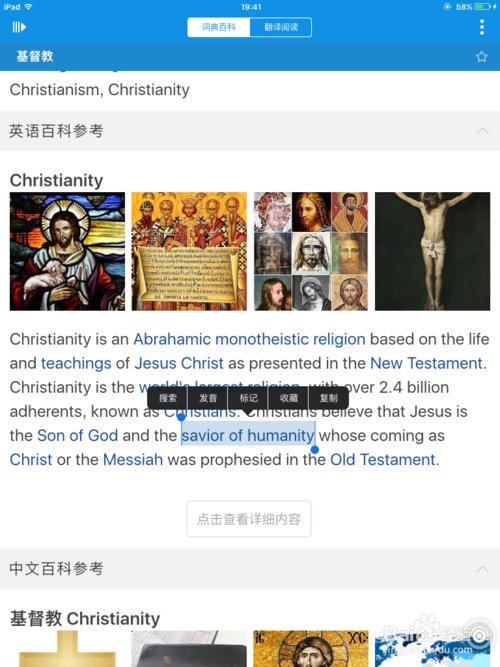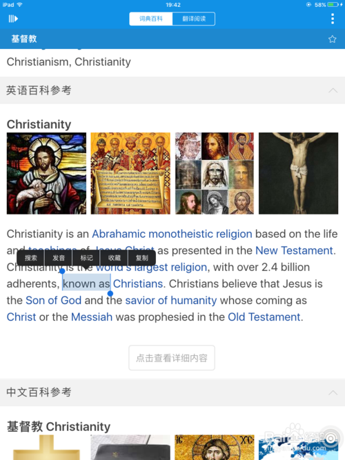 新版的欧路查词模块词典链入了英文版的维基百科,这是个非常好的资源,在查词界面就可以阅读。在这个界面,如果要查的词不在链接中,只要点击一次,就会弹出它的词义。如果单词在链接中,一点击就会翻到新的页面,需要点击查词输入框中的词才能返回。查询链接中单词的办法是,长按旁边没有链接的单词,滑动到要查的词上面手指离开,这时候只要点击弹出菜单上的“搜索”按钮就会弹出解释界面。