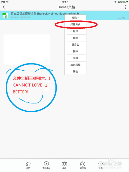 在欧路词典的阅读模块还可以阅读电子书。阅读之前要先把电子书上传到欧路词典里面。上传电子书有两种办法。一种是用欧路自己的WIFI传输模块上传,另一种是用第三方软件,例如功能强大的免费软件“文件全能王”来导入。先把电子书文件上传到文件全能王的文件夹,长按该文件,选择“打开方式”,再选择“拷贝至欧路词典”,然后就可以在欧路里面打开阅读了。
