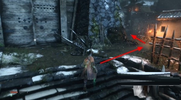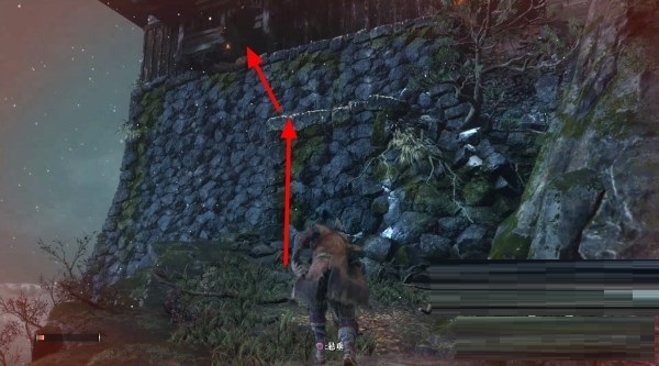 过来之后一直向前走,到下图位置,使用钩绳到苇名城·城邑鬼佛处,并点燃鬼佛。