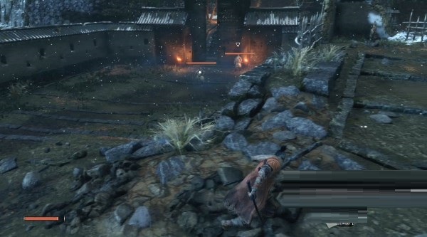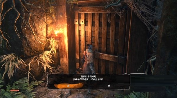 离开暗道之后,发现一个身背长弓的武士在等待我们,根据皇子的话得知此人是苇名弦一郎,他是来带走皇子的,我们当然不同意,随即展开战斗!