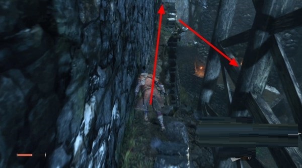 此时我们跟着提示,按照下面三张图的红色箭头路线走。白色的边缘是可以用手抓着悬垂的,日后用处很多