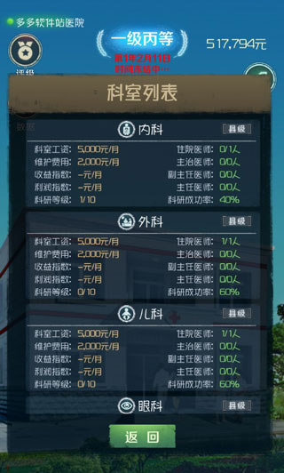 1、游戏内科室分为县级、市级、省级、国家级、世界级五个级别,科室等级将影响病人的数量和疾病的等级,科室等级可通过扩建提升;