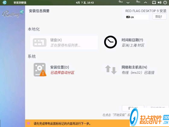 安装摘要主要是包括键盘、时间日期、分区、和网络主机名的界面。每个功能可单独进入修改信息。
