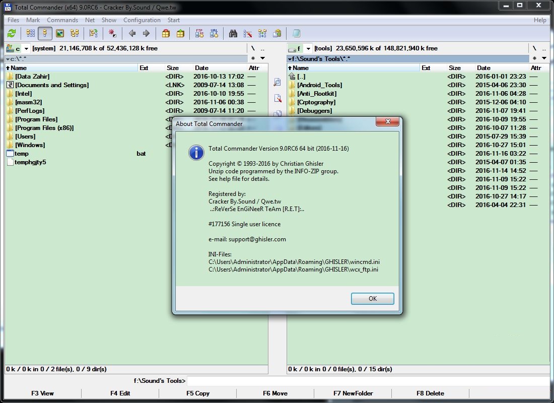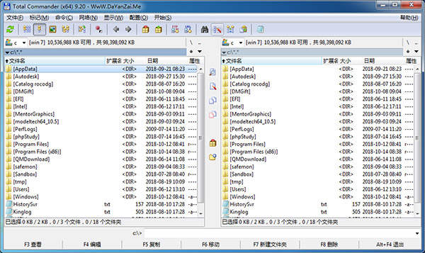 Total Commander (简称 TC)原名 Windows Commander,是一款着名的文件管理软件,功能与 Windows 资源管理器类似,但更为强大、方便、实用!TC 与资源管理器的不同之处在于,它固定有两个并排的文件窗口,可分别称之为来源窗口和目标窗口,您可以在两个窗口间轻松实现对文件(夹)的操作,其方便程度是资源管理器难以比拟的!通过 TC,您可以方便快捷地实现对文件的查看、编辑、删除、重命名、批量重命名、搜索内容、快速定位、压缩或解压、分割或合并、编码或解码、FXP/FTP 连接等操作;支持多标签界面,让原有的两个窗口可以扩展为几十个,操作更显自由;贴心的工具栏、按钮、历史和常用文件夹等设计,让您访问文件资源更方便;通过工具栏和菜单,还可以随意调用外部程序和内部命令;内置多种格式的压缩/解压功能,支持在压缩包中搜索文件及内容;它还支持正则表达式。需要特别强调的是,TC 具有无可比拟的可扩展性。它支持自定义菜单界面、图标资源、语言文件、操作习惯,还可使用各种功能的插件。通过定制资源和使用插件,可以使之界面更美化、使用更方便、功能更强大!【软件特色】