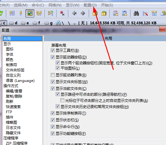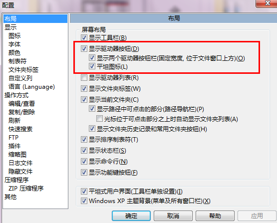然后从第一行开始设置:在布局选项卡里小编只把显示驱动器按钮以及方的两个复选框选中 。因为这样会在每个窗口的上方出现一排驱动器按钮,切换驱动器时更方便。其他的都保持不变。如果是第一次设置的话,同学们可以根据小编的勾选情况进行一模一样的勾选。