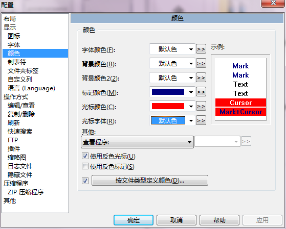 在“颜色”页面,用户能定制TC文件列表窗口的配色方案,可以设置显示的文字,标记,光标等等的颜色,还可以设置两种背景色并交错显示。页面右边的示例则实时显示当前配色的效果,但实际上由于字体的不同,示例与真实的效果并不完全一样,建议设置后点“应用”按钮查看实际效果。