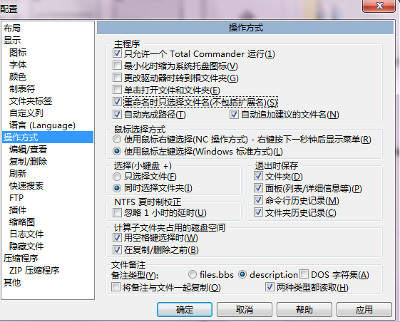 1)打开“操作方式”界面,在主程序下选择只允许一个Total Commander运行。在“鼠标选择方式”组框中选中“使用鼠标左键选择”。其他暂时保持不变。