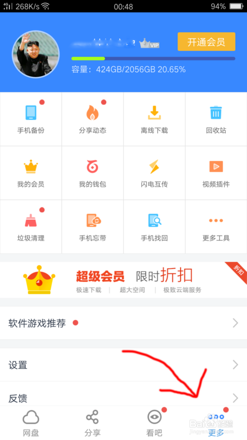 打开百度云破解版2019安卓app并且登录进去,点击底部“更多”的选项