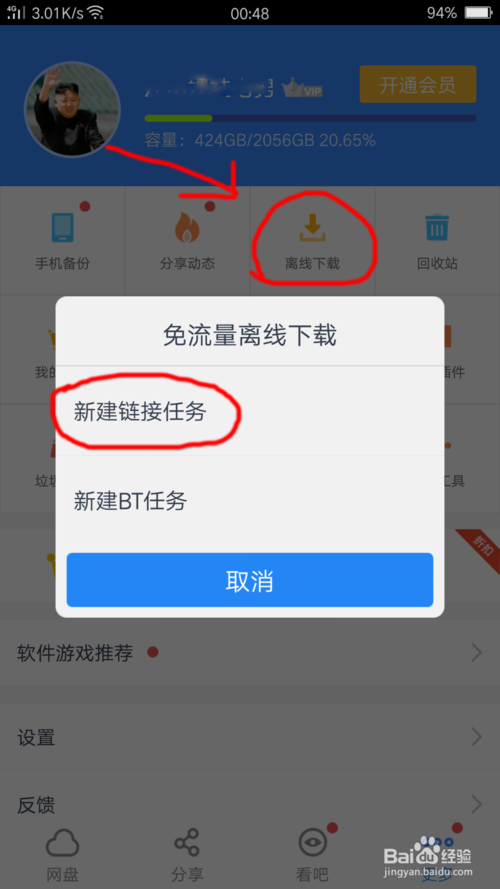 在选项 "更多" 的这个页面中,点击“离线下载”这个功能,然后选择“新建链接任务”