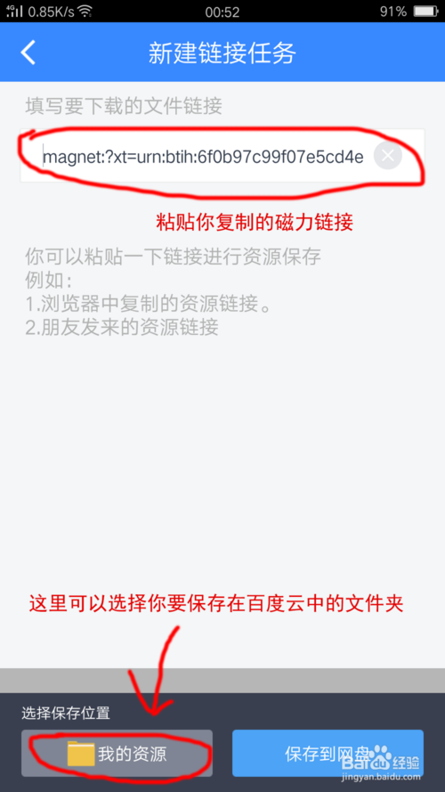 在“新建链接任务”的页面中,粘贴你复制好的“磁力链接”,然后选择你要保存在百度云中的文件夹,图片中是选择保存在“我的资源”,你可以自行选择保存位置,然后点击保存到网盘