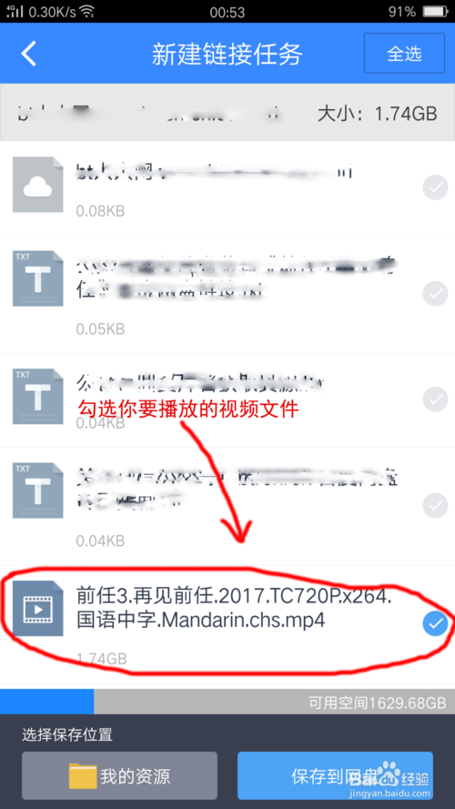 此时会弹出文件列表,一般磁力链接会有多个文件,我们只要勾选我们需要播放的视频(电影)就行了,然后再点击保存到网盘