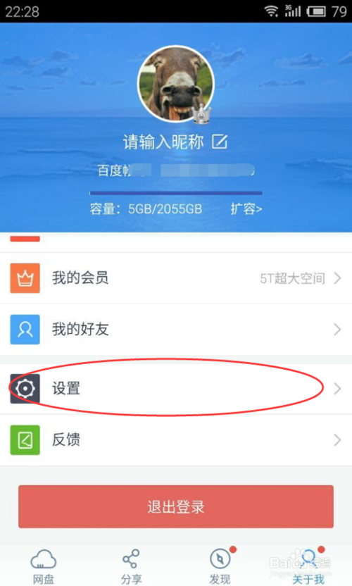 打开你的手机”百度云“APP,进入主界面后,点击下方的”关于我“菜单,并选择“设置”。如下图所示
