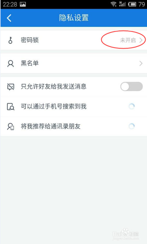 进入”隐私 设置“后,我们会看到 ”密码锁“的状态是”未开启“,那么就点击它,进行设置。如下图所示