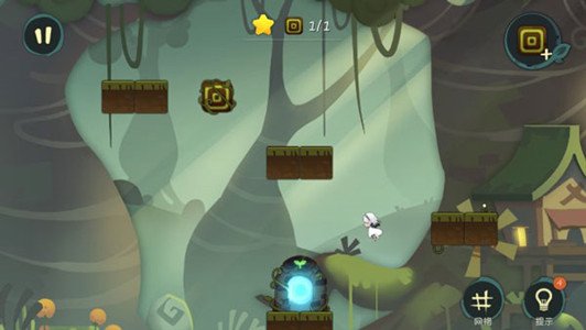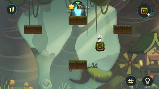 第1关:这款一关属于比较简单的那种,先将左侧的符文拉拽至中间,跳上带有气泡的符文。