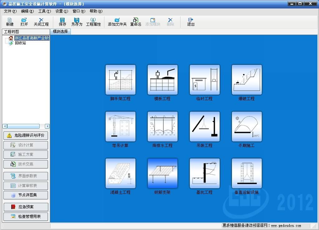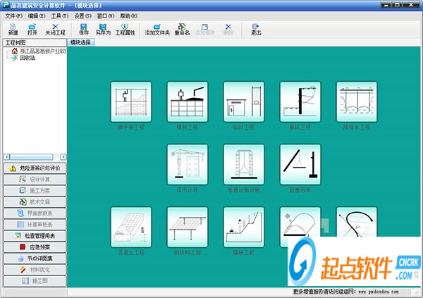 软件模块:脚手架工程、模板工程、塔吊计算、临时工程、降排水工程、钢结构工程、混凝土工程、起重吊装工程、基坑工程、爆破工程、冬期施工、垂直运输设施。