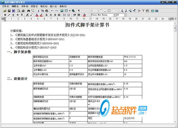 在脚手架参数设置界面中对各参数进行设置后,点击“生成计算书”按钮即可将结果以计算书的形式显示出来如下图,计算书可保存为.doc/.rtf文件。