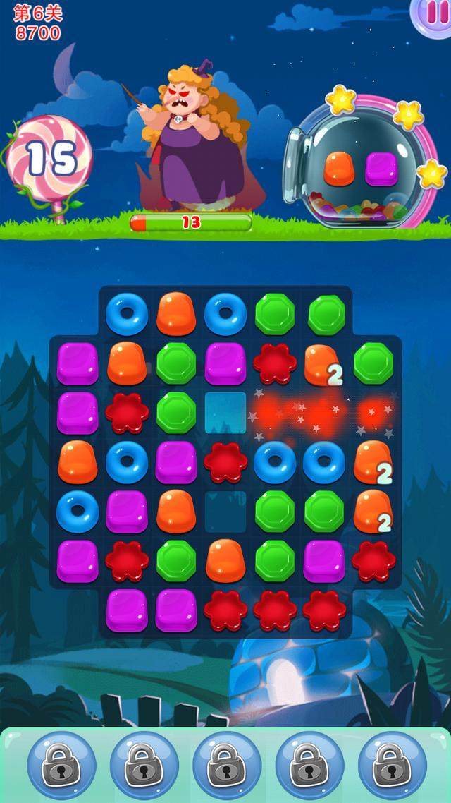 三个女巫一台戏,要么射出几个小怪兽,要么赐予几颗硬糖,要么冰冻某些糖果…总之,她们会想尽一切办法,不让你安宁,唯一的办法就是你必须尽快的消灭她们。