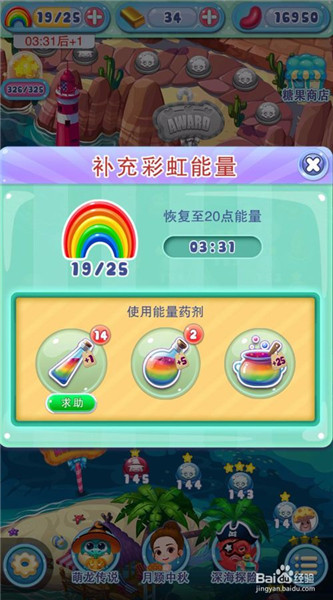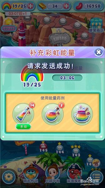2、我们也可以找好友求助,首先点击客户端打开界面左上角彩虹桥的后面的加号就会出来一个补充彩虹能量的提示,下面有三个能量瓶,第一个上面有个求助,我们点一下。