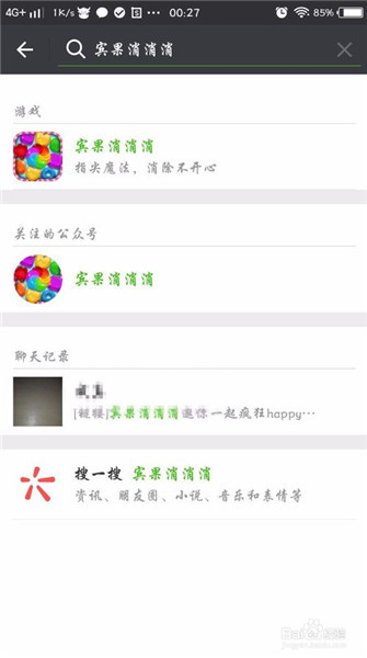 5、另一个办法是,从微信上面,找到添加朋友的地方,输入宾果消消消这几个字,就会出来几个选项的菜单,我们不要点游戏,点开公众号。