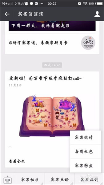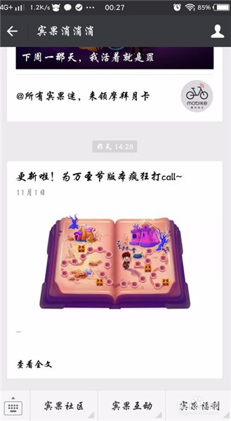 6、然后就进入到公众号里面,看到最下面有几个选项,宾果社区,宾果互动,宾果福利,我们点开宾果福利。