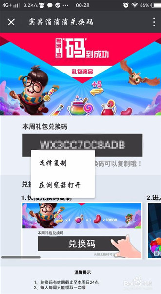 9、我们长按兑换码,就会出现一个选择复制的选项。