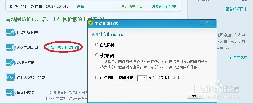 ARP防御默认是“自动防御”,如果效果不太好,可以点“自动防御”来更改模式。