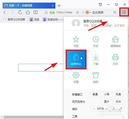 1、打开QQ浏览器,在设置中心,打开应用中心
