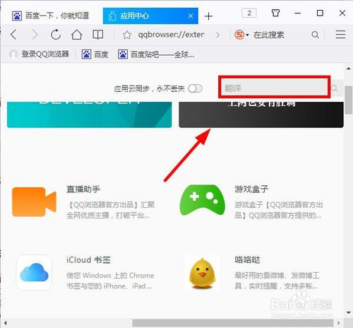 2、打开应用中心后,在右上侧输入“翻译”,并搜索