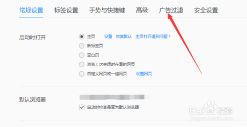 4、然后点击默认浏览器设定右侧的三角形,如下图所示。
