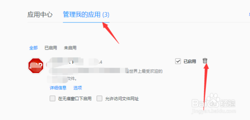5、在该页面,可以对该插件选择启用或者禁用功能,或者点击左下角的“应用中心”,对插件进行管理。