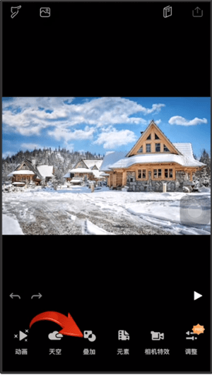 接着在相册中选择你要添加烟雾的图片,再点击底部的【叠加】选项;