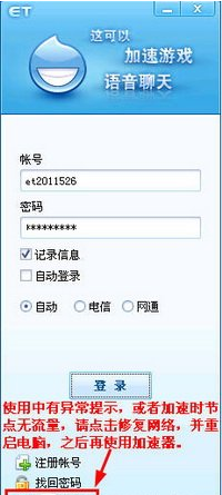 A8: 使用中有异常提示,或者加速时节点无流量,请点击ET登陆界面下方的修复网络,并重启电脑,之后再使用ET。