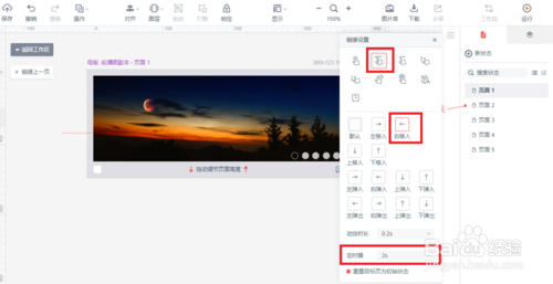 修改手势的属性。将手势的属性改为”向左滑动“,"右移入",定时器"2s"。这里注意的是最后的页面要链接到第一个页面,才能实现轮播。