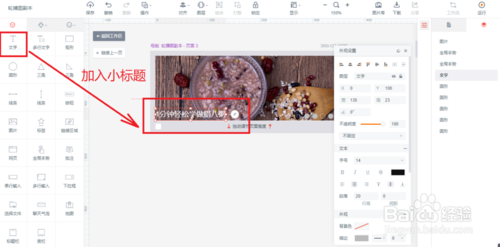 然后回到“组件”栏目,为首页插入图片和文字。图片调节在右边的设置栏,这里推荐大家直接拖入图片,然后用鼠标调节大小这样会比较方便。文字的调节在左边的主题栏目,可调节文字的大小和样式,然后用鼠标摆至合适的位置。