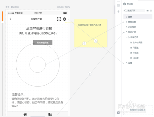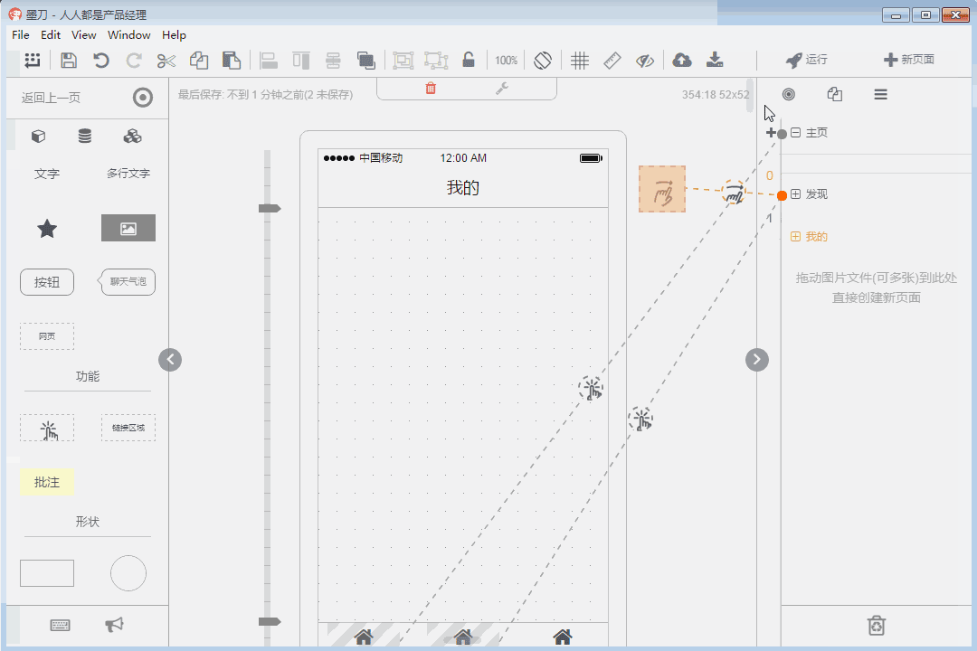 这里介绍一个墨刀非常有特点的功能,就是通过连线的方式进行页面之间的跳转,在应用中选择任何一个控件,图片或者文字都可以通过添加手势和页面切换方式实现页面跳转。优点在于操作方便,且比较直观。缺点是如果页面复杂,跳转比较多,会有非常多交叉在一起的线,容易连接出错。