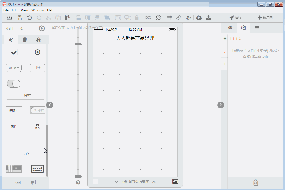 墨刀对于APP的原型设计真的是体验非常好,怎么说呢?就像有一个无形的人在帮助你,和你一起打造你的原型APP。(当然以后也适用微信小程序的设计),其控件的拖拉、大小的调整,都会自然的去匹配相应的母版大小。无需去担心有多移动一点或多 选择一点。并且墨刀的系统控件都是基于APP,以及系统平台IOS和安卓,因此在里面可以首先选择相应的设备布局,减少了不少工作环节。
