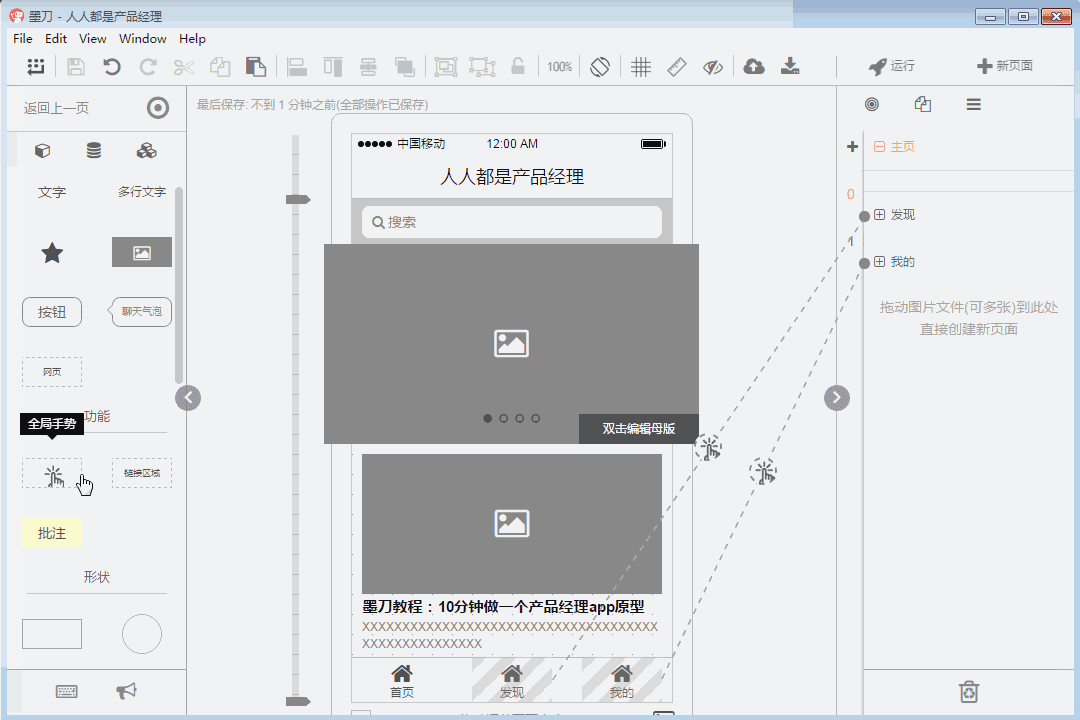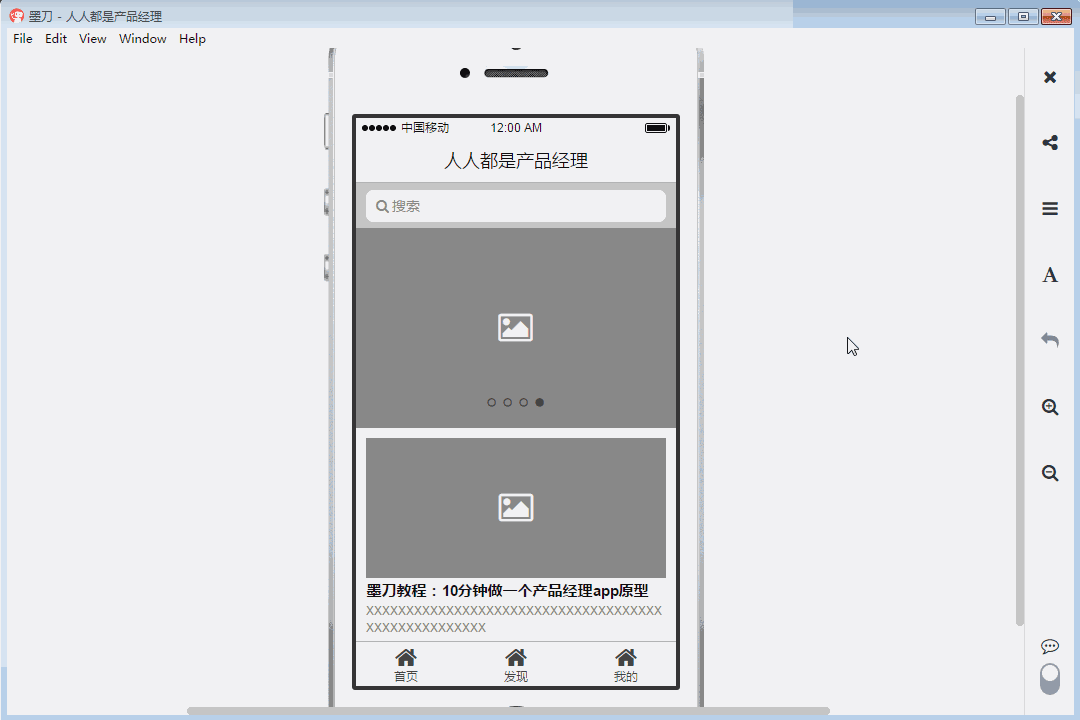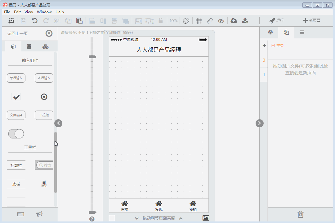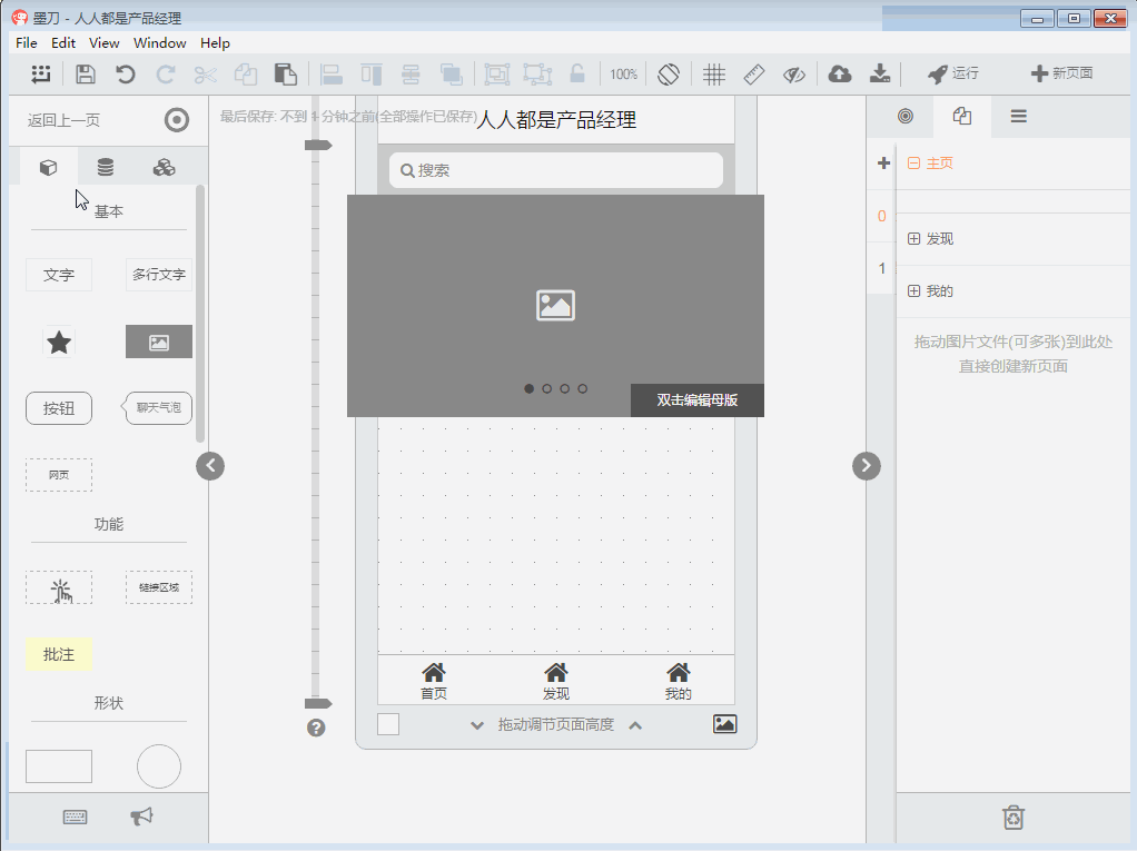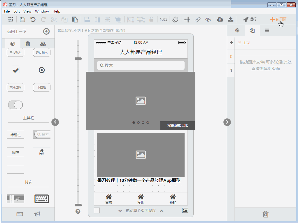 然后我们开始简单的制作下“产品经理”的首页原型,在左侧的“组件”栏目中找到搜索组件,拖入App首页中,在“母版”栏目中找到轮播图模版,拖入应用之中。墨刀中有一些已经做好的组件或母版,可直接拖入使用,加快创建原型的时间。