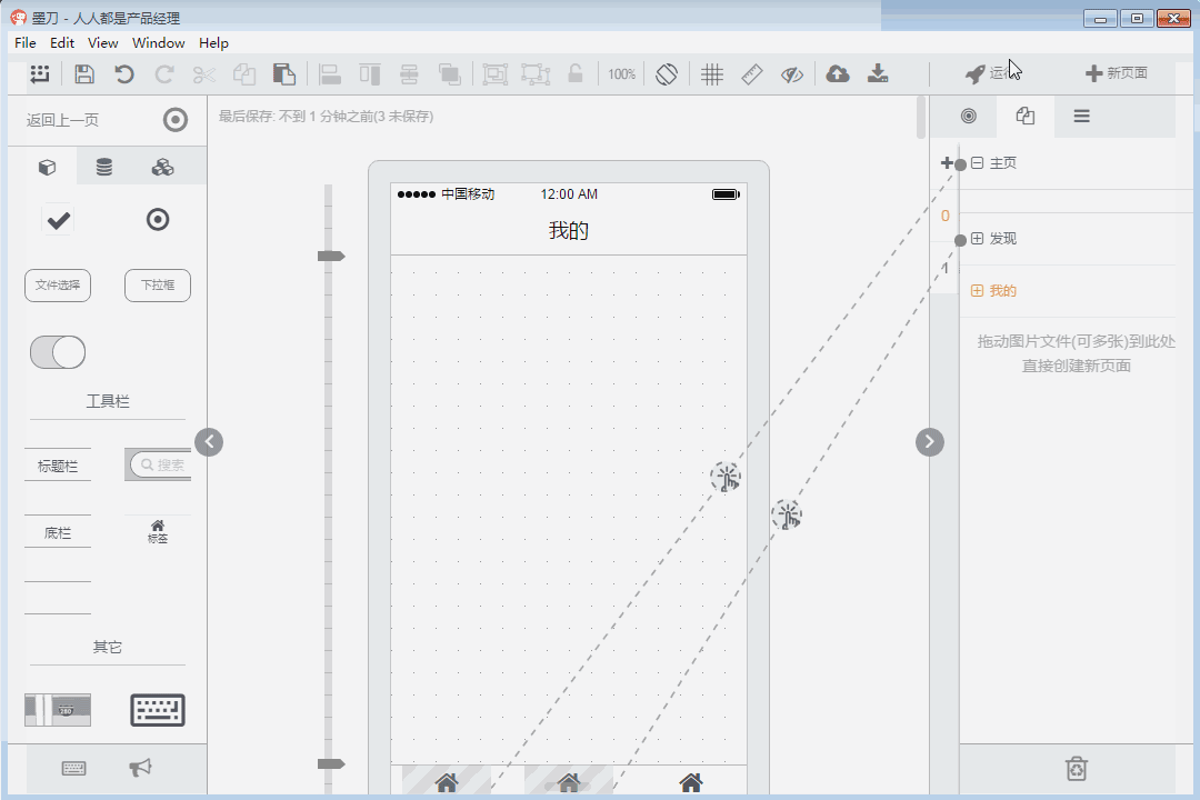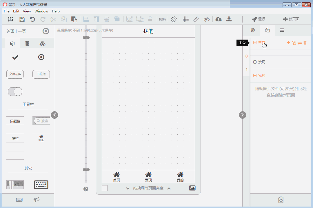 在软件右上角点击“+新页面”即可生成新的页面,每一个页面有复制、删除、添加子页面的功能。在新的页面中添加标题栏,复制首页的底部导航,粘贴至新的页面,注意粘贴时用于粘贴至“原位置”。按如此方式制作“发现”页面和“我的”页面。